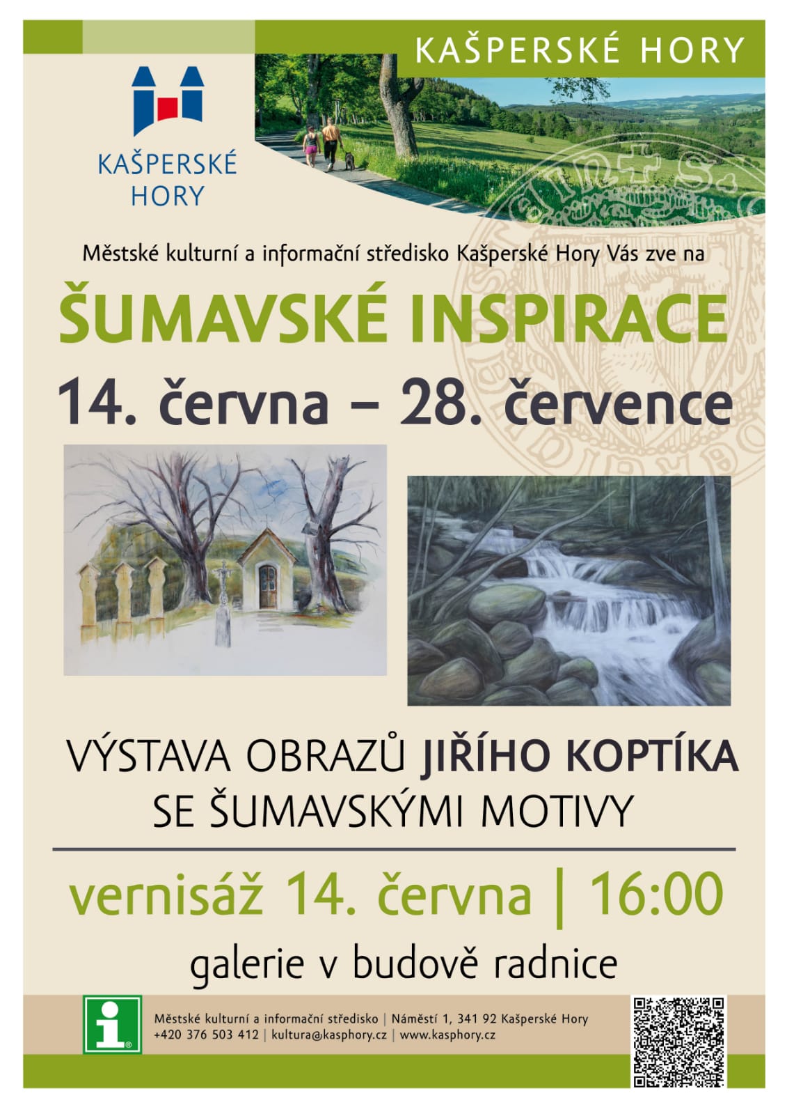 Městské kulturní a informační středisko Kašperské Hory a výtvarník Jiří Koptík vás zvou na výstavu obrazů se šumavskými motivy s názvem Šumavské inspirace.